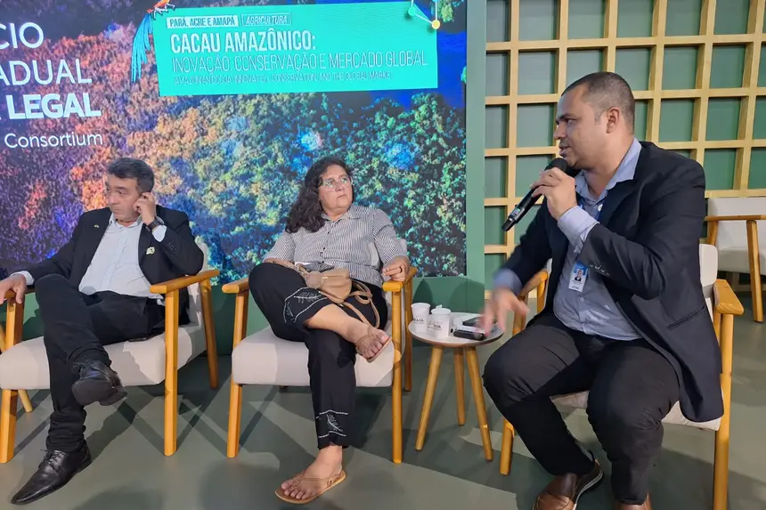 Belém, Pará – A produção do ‘Cacau amazônico: inovação, conservação e mercado global’ foi tema de um painel que reuniu representantes de órgãos ligados à agricultura do estados do Pará, Acre e Amapá, no estande do Consórcio Interestadual da Amazônia Legal na Conferência das Nações Unidas sobre Mudanças Climáticas (COP 30), em Belém, na quinta-feira, dia 20.
